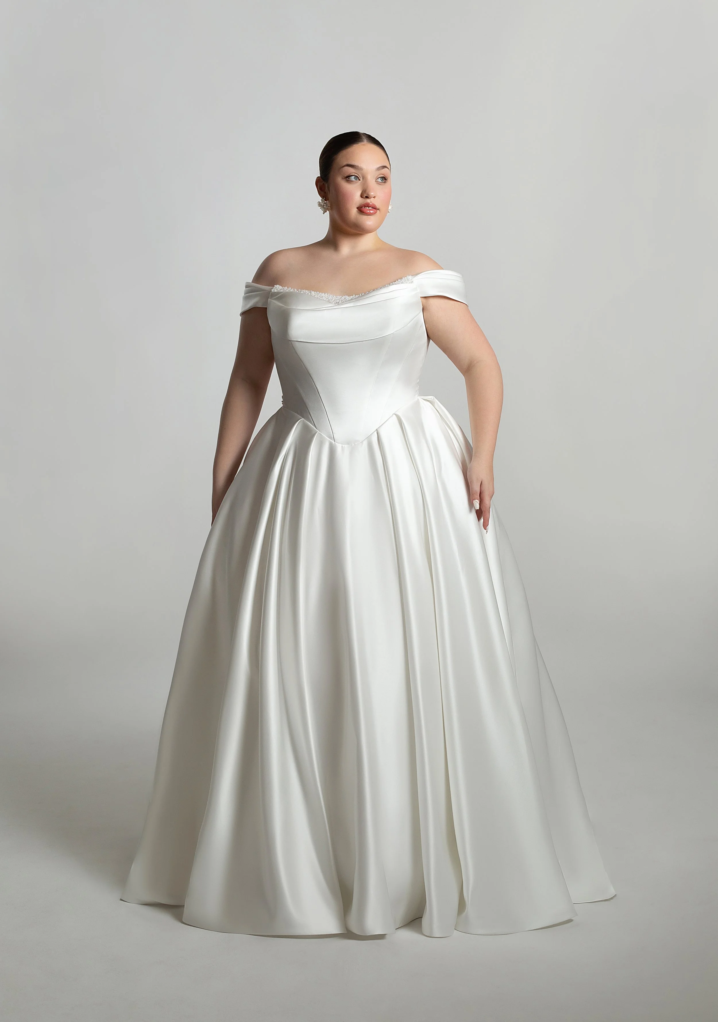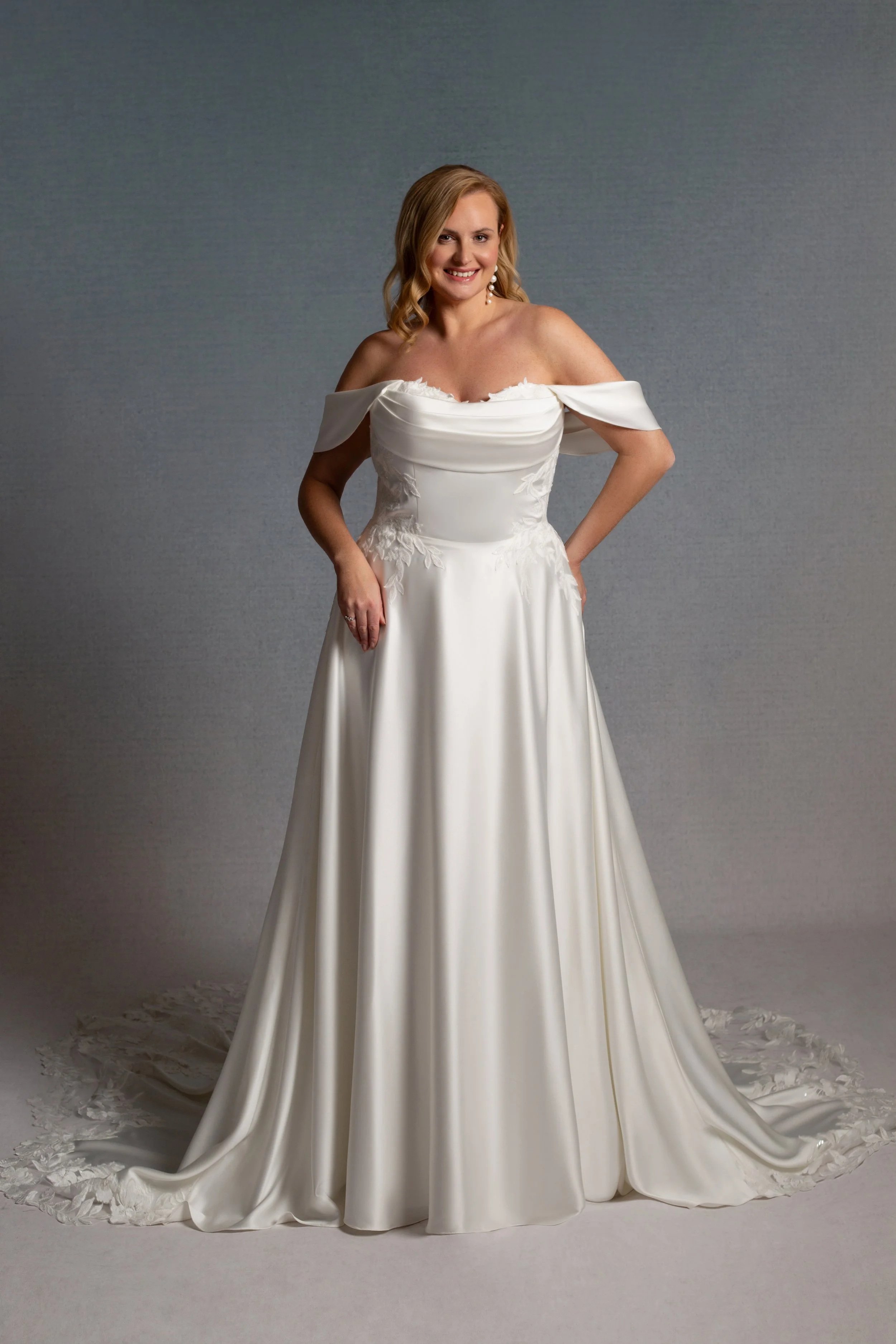 A gorgeous satin plus size wedding dress with ruched bodice and straight neckline. A traditional cut circular skirt is timeless and romantic and pair this satin beauty with a gorgeous cathedral length veil for extra drama! The off the shoulder straps are feminine and create a gorgeous shape across the neckline and arms. Sample size in store UK22