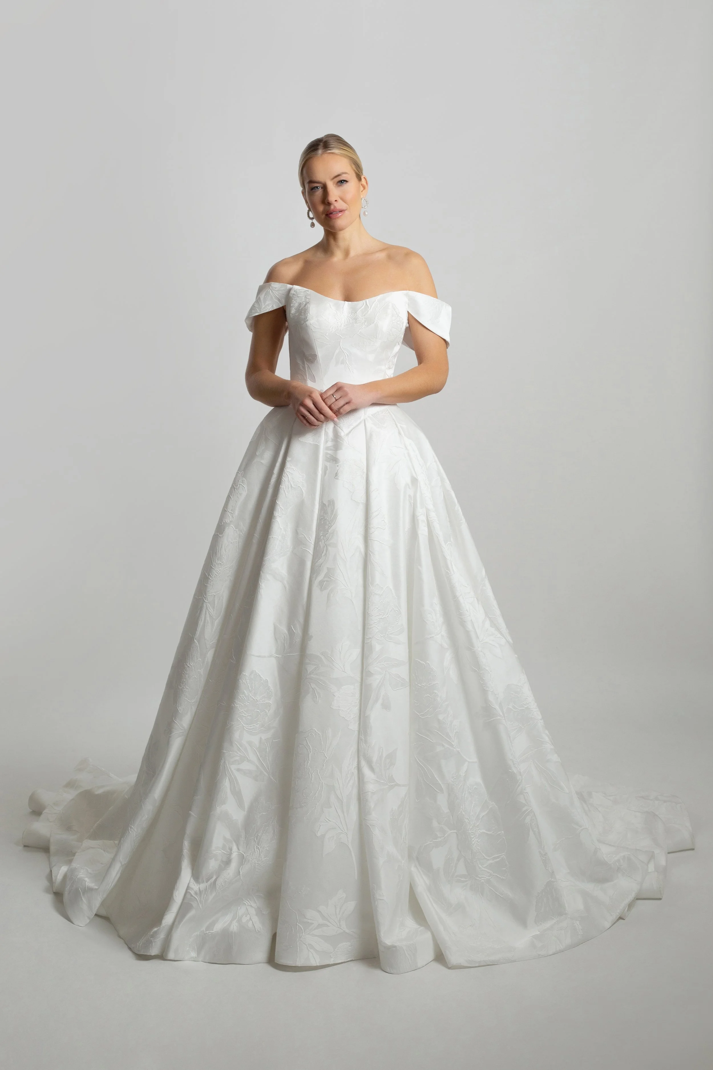 Classic and elegant aline wedding dress in soft, sumptous satin. Nicely structured in the bodice to give support to a full bust, coupled with a softly structured off the shoulder strap in a timeless finish. A thin satin belt adds definition to the waist and the pockets and buttons are a subtle yet fun addition to this classic design. Sample size available UK24